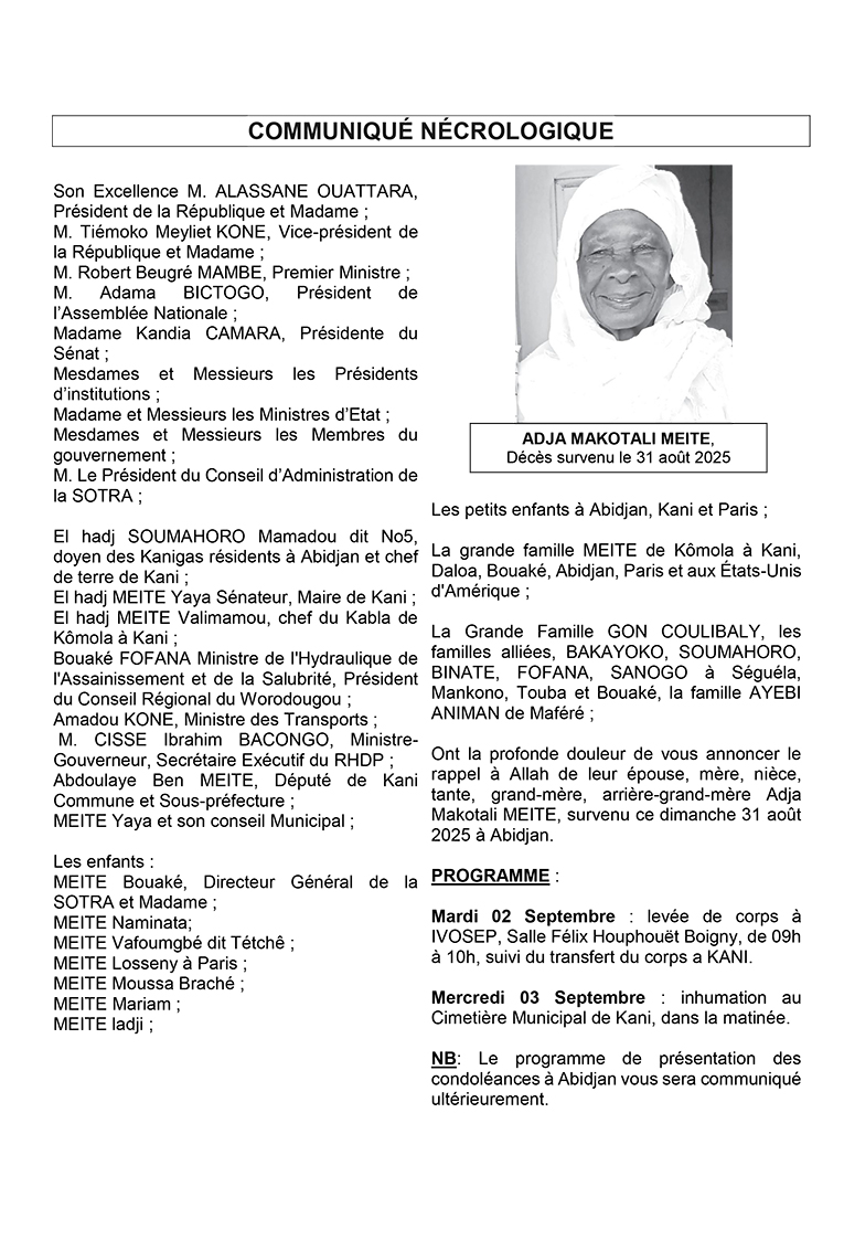 Communiqué : Le programme des obsèques de la Mère du DG de la SOTRA